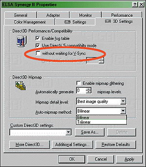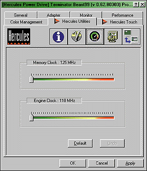Затронув тему быстродействия, предвосхитим вопросы со стороны пытливой публики, касающиеся так называемого «твикинга» (tweaking — здесь отладка, разгон, ускорение параметров). Нет, мы сознательно не разгоняли наших дорогих пациентов на бескрайних просторах «квэйков», «анреалов», «инкомингов» и иже с ними. Для непосвященных добавим, что производители плат, а иногда и независимые программисты в дополнение к официальному сертифицированному ПО помимо драйверов и утилит конфигурации предлагают утилиту Overclock или Tweak для проведения незатейливых экспериментов с частотой видеопамяти и графического процессора. Бесценный опыт, накопленный в битвах за повышение тактовых частот центрального процессора, и по сей день будоражит умы увлеченных селекционеров, давая благодатные всходы уже на ниве 3D-ускорителей. Подобные эксперименты по-своему интересны, однако следует помнить, что, заставляя плату работать в ускоренном темпе, вы подвергаете и ее, и себя определенному риску. Как говорится, недокомментированные возможности раскрывают перед вами широкий оперативный простор для маневра, вот только ни о какой гарантии и уж тем более (не к ночи будет сказано) о страховом полисе тут и речи быть не может. Без комментариев!