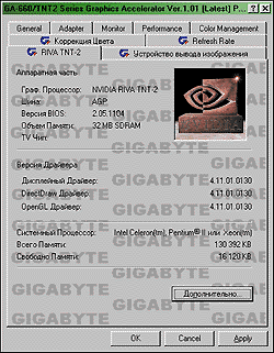 Согласно OEM-контракту, Gigabyte получает доступ к библиотекам так называемых reference-драйверов разработчика набора микросхем, в данном случае — компании nVIDIA. Завершив инсталляцию GA-660 и поработав с адаптированным ПО, мы по достоинству оценили труд программистов и инженеров Gigabyte. Функциональные возможности драйверов и утилит были признаны одними из лучших в обзоре. И дело здесь не только в русифицированной версии программного пакета, но и в том сервисе, который становится доступным и понятным даже для начинающего пользователя, впервые постигающего мир 3D. К слову, обновленные версии драйверов от nVIDIA, устанавливаемые поверх старых, не замещают (как это происходило с образцами других производителей) оригинальные закладки, созданные при установке платы, а корректно подключаются к ним в качестве дополнительных опций. Обращает на себя внимание закладка настройки параметров частот регенерации экрана. В связке плата—монитор для нее не существует фиксированных значений. Это значит, что, обладая не самым интеллектуальным дисплеем, вы всегда сумеете заставить договориться эти два основных устройства вашей видеоподсистемы.