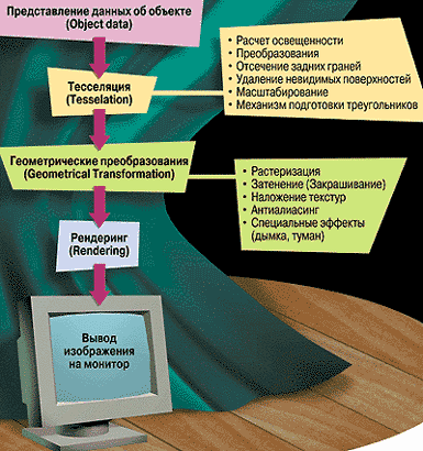 1. Представление данных об объекте (Object Data) следует, пожалуй, называть основой будущего сценария, поскольку на этом этапе оформления сцена лишь зарождается в умах дизайнеров, аниматоров, художников и прочего творческого люда, а также отцов-идеологов будущего действа в целом (если это игровой проект) и создателей отдельных его персонажей в частности. На этой стадии 3D-ускоритель принимает участие опосредованно, да и то лишь в том случае, когда разработчик уже сделал ставку на конкретную модель и в дальнейшем вынужден будет работать с оглядкой, постоянно учитывая возможности кристалла и ограничивая полет своей фантазии. В общем случае «железо» на этом этапе ни при чем.