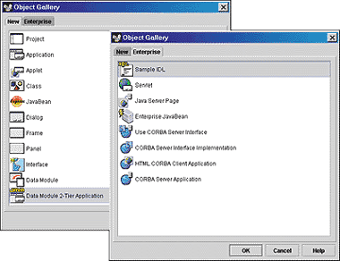 Поскольку в данной статье рассматривается бета-версия JBuilder 3 for Solaris Field Test 3 (билд 3.0.319.0), довольно трудно определить, насколько изменилась палитра галереи объектов. Однако можно точно сказать, какие объекты и мастера уже есть на тех двух закладках (New и Enterprise), которые удалось увидеть. На закладке New располагается стандартный джентльменский набор для создания приложений, аплетов, компонентов JavaBeans и т. д. Закладка Enterprise адресована корпоративному разработчику и в основном связана с технологией CORBA (рис. 3).