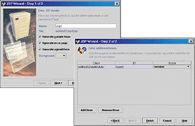 Что касается закладки Enterprise, то она весьма и весьма интересна. Взять, к примеру, генератор серверных страниц Java (Java Server Page). Такого рода страницы находятся в «юрисдикции» Java 2 Enterprise Edition (J2EE), как, впрочем, и некоторые другие приложения и объекты, создаваемые JBuilder 3 for Solaris. Мастер построения создания серверных страниц за два шага генерирует исходные тексты, причем и для самой странички и для подчиненного компонента JavaBean (рис. 4).