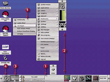 Графический интерфейс в Red Hat Linux по умолчанию обеспечивается средой под названием GNOME (сокращение от GNU Network Object Model Environment), основанной на сетевой объектной модели. У нее много общего и с Windows, и с KDE: всплывающие меню, Панель задач и Диспетчер файлов, очень похожие на разработанные Microsoft, плюс несколько рабочих столов, как в KDE. Однако некоторые свойства Linux, используемые в GNOME, покажутся пользователям Windows странными и неудобными.
