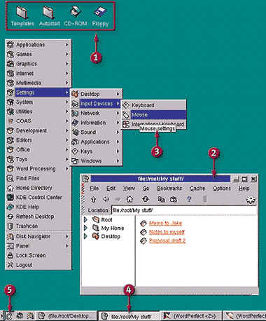 У Linux, в отличие от Windows, нет стандартного пользовательского графического интерфейса. Зато существует несколько бесплатных экранных сред. По умолчанию такие функции в OpenLinux выполняет программа KDE (сокращение от K Desktop Environment; буква K не обозначает никакого слова) версии 1.1.
