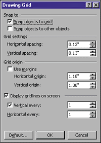 В зависимости от ваших потребностей также можно изменить шаг сетки по горизонтали и вертикали. Для этого выведите на экран (если ее нет) панель инструментов «Рисование» (Drawing). В любом ее месте щелкните правой кнопкой мыши и выберите пункт «Рисование» (Drawing). Нажмите расположенную на панели инструментов кнопку «Действия» (Draw), а затем в появившемся меню отметьте пункт «Сетка» (Grid). На экране появится диалоговое окно «Привязка к сетке» (Word 97, 2000). В нем можно изменить установки горизонтального и вертикального интервала, а также сместить точки отсчета сетки по горизонтали и вертикали (этот параметр задает то расстояние от края страницы, на которое вы планируете переместить графическое изображение). В Word 2000 сетку можно вывести на экран, что упрощает выравнивание графических объектов. Сама сетка на печать не выводится.