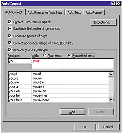 Не снимая со слова выделения, выберите пункты «Сервис?Автозамена» (Tools?AutoCorrect). Перейдите к закладке «Автозамена» (AutoCorrect), если она не активизирована. Убедитесь, что опция «Заменять при вводе» (Replace text as you type) включена. В поле «Заменить» (Replace) диалогового окна «Автозамена» (AutoCorrect) введите необходимое слово, включите опцию «Форматированный текст» (Formatted Text) и нажмите кнопки «Добавить» (Add) и ОК.