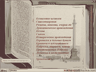 А ведь стоило только вооружиться дисками CD-ROM с магическим словом «Пушкин» на обложке — и подготовиться к любому выступлению не составило бы труда. Тем более что их в итоге оказалось целых три варианта — на любой вкус. О двух из них мы уже рассказывали нашим читателям в статье «Пушкин-шоу: мало не покажется» («Мир ПК», №2/99, с.110). Обратила на себя внимание и интересная, на наш взгляд, попытка использовать наследие поэта в качестве этакого «оформительского» элемента для диска, посвященного художественной миниатюре (компания ЦИТ КАМИ).