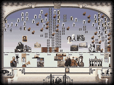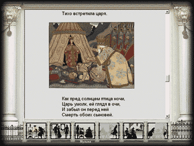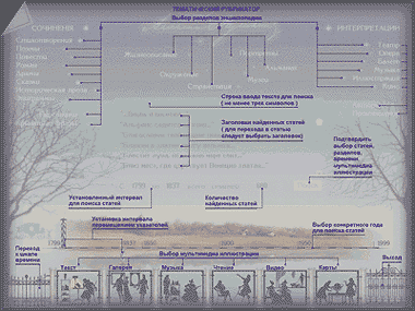 Как на самих создателей диска повлиял великий Пушкин, можно судить по неординарному пользовательскому интерфейсу этого продукта. Нежный серо-голубой фон основного экрана повторяется и в других разделах диска. В нижней части «рабочего поля» находятся окошки со стилизованными рисунками, обозначающими основные функции программы. Если функция недоступна, окошко прикрывается занавесью. Слева от окошек расположена калиточка, через которую можно попасть к шкале времени, а оттуда легко шагнуть в Internet. Впрочем, Internet, настройки и подсказки доступны из каждого экрана.