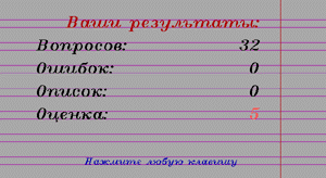 Программа отслеживает правильность ответа и в случае ошибки позволяет его исправить. В любой момент можно получить подсказку, но если вызвать ее больше двух раз, оценка не ставится. Следует заметить, что программа оценивает ученика очень строго — нельзя получить даже «удовлетворительно», если набирается много ошибок.