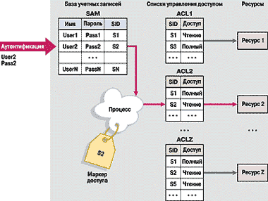 При доступе уже к конкретному ресурсу пользовательский процесс предъявляет маркер доступа. Система безопасности сравнивает указатели маркера доступа со списками управления доступом и при совпадении разрешает соответствующий доступ.