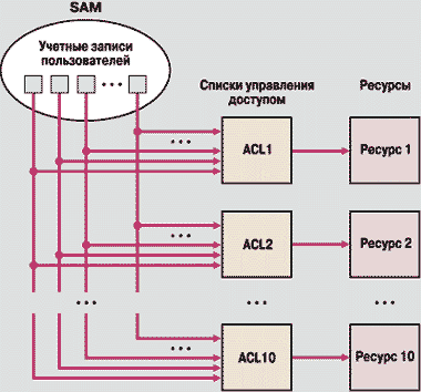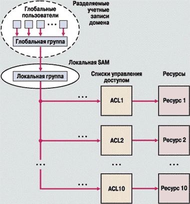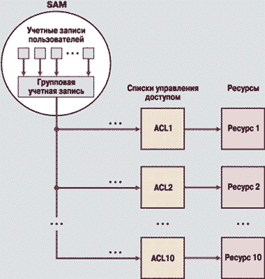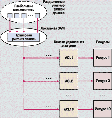 Если использовать самый простой способ формирования системы безопасности (рис. 2), то сначала следует добавить в базу учетных записей SAM каждого из 5 серверов по 100 учетных записей (всего 500 операций по созданию учетных записей пользователей). Затем нужно выполнить операции включения каждой учетной записи в каждый список управления доступом. Следовательно, в список управления доступом к каждому из 10 ресурсов каждого из 5 серверов должны быть включены по 100 учетных записей пользователей: 10x5x100 = 5000.