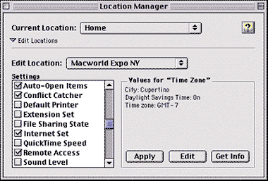 приложение, позволяющее создавать группы настроек программ для вашего Macintosh. С помощью Location Manager можно изменить такие параметры, как конфигурация AppleTalk и TCP/IP, выбранный по умолчанию принтер, уровень звука и временной пояс.