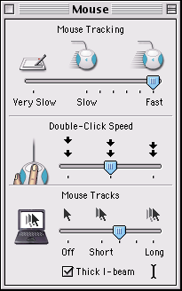Следы курсора мыши. Иногда трудно бывает найти на экране указатель мыши, особенно если солнечные лучи падают прямо на изображение. Поиск можно упростить: откройте панель управления Mouse (мышь) командами Apple?Control Panel и включите опцию Mouse Tracks (следы мыши). При включенной опции перемещение курсора отмечается быстро исчезающими следами. Опция Thick I-beam (толстый курсор) в той же панели управления позволяет увеличить видимую на экране толщину текстового курсора.