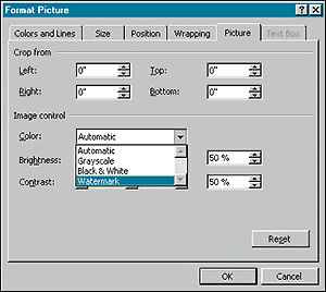 | Для создания водяного знака в диалоговом окне «Формат рисунка» выберите опцию «Подложка» |