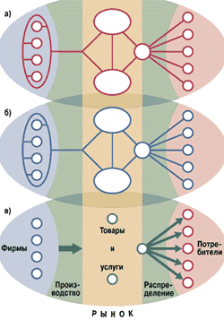 | Примерная схема модели рыночной экономики для постиндустриального общества: а) сетевая, б) транспортная, в) информационная поддержка бизнес-процессов инфраструктуры рынка |