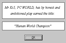 Программа Fritz 6 («Мир ПК», № 1/2000, с. 97) летом 1999 г. выиграла гроссмейстерский турнир во Франкфурте, показав результат, соответствующий 2825 по шкале Эло. Напомним, что в то время рейтинг Г. Каспарова равнялся 2851, а следующего за ним В. Ананда — 2771. Поэтому неудивительно, что Fritz 6 могла присвоить титул «Human World Champion» каждому, кто достигнет уровня 2800 единиц, играя с ней «на рейтинг».