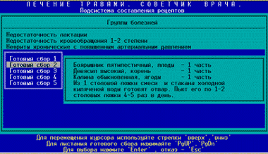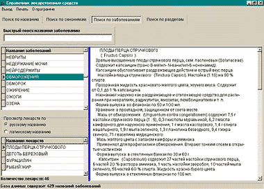К травам в нашей стране отношение неоднозначное. Как правило, врачи редко рекомендуют их применять. Тем не менее известно, что травы хорошо помогают в комплексе с другими средствами. Если, например, при бронхите лекарственные препараты дополнять настоями или отварами, то выздоровление наступит быстрее. Поэтому и была создана специальная программа, которая для какой-либо определенной болезни из представленного списка, допустим бронхита или язвы желудка, предложит на выбор сборы трав. Можно прочитать о каждой из составляющих и распечатать справку-рецепт с подробным описанием способа приготовления и применения данного сбора. Если же вы предпочитаете пользоваться справочником, то можете задать поиск по русскому, латинскому или народному названию, а также по названию болезни.
