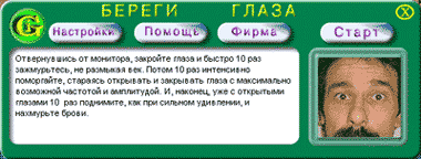 Продукт будет полезен пользователям, проводящим много времени за компьютером. Эта русскоязычная программа помогает сберечь зрение. Она сама напоминает, что пришло время делать гимнастику, и выводит на экран описания необходимых упражнений для глаз.