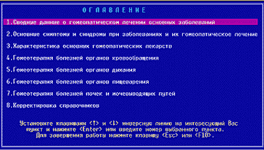 Эта справочная система посвящена одному из самых больших разделов нетрадиционной медицины — гомеопатии. Запустив программу, вы сначала попадаете в оглавление, из которого можно следовать по назначению. Внизу каждого из информационных окон расположена подробная справочная система по навигации. После выбора интересующего раздела система выдаст нужную информацию.