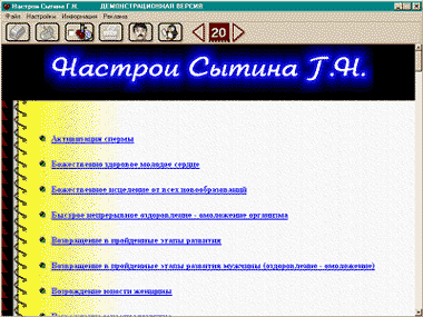 Содержит более 130 настроев Г.Н. Сытина для профилактики и лечения самых различных заболеваний, в том числе диабета, ожирения, импотенции, заболеваний сердечной и дыхательной систем, печени, почек, онкологических заболеваний и т. д. Можно выбрать ручной или автоматический режим чтения, задать скорость, фоновую мелодию и многое другое, что необходимо для комфортного и эффективного усвоения.