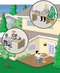 Разместите сетевые устройства. При выборе места для каждого настольного ПК помните, что диапазон действия радиоволн ограничен. Особое внимание обратите на те ПК, чьи ресурсы (например, принтер или доступ в Internet) вы хотите использовать совместно, — они должны находиться в «поле зрения» всех остальных ПК. Если вы намерены подсоединить в беспроводную сеть блокнотный ПК, то всякий раз, обращаясь к нему, помните, что он должен входить в рабочий диапазон одного из ПК.