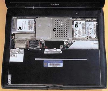 | Рис. 2. Скрытые достоинства. Под откидывающейся клавиатурой PowerBook «спрятаны» разъем для установки платы AirPort (A), жесткий диск (B) и разъем для оперативной памяти (C). |