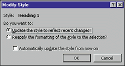 Редакторы Word 97 и 2000 для заголовков и других типов текста содержат наборы стилей, используемых по умолчанию. Но зачастую приходится изменять стили, чтобы они отвечали требованиям ваших собственных документов. Вот быстрый способ настроить стили. Начните вводить текст, а затем установите выбранный стиль. Можно также выделить некоторый блок текста, оформленный в данном стиле. После этого установите курсор мыши в поле «Стиль» (Style) панели инструментов «Форматирование» (Formatting) — не следует использовать ниспадающий список «Стиль» — и нажмите клавишу