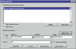 Допустим, вы создали документ в прошлом месяце или даже год назад и теперь никак не можете его найти. Вы знаете, что сохранили файл на жестком диске, но не помните ни его имя, ни каталог, в который поместили этот файл. Редакторы Word 97 и 2000 способны справиться с вашими проблемами. Все, что потребуется от вас, — набрать одно уникальное слово или фразу из документа, например имя адресата либо название компании. Чтобы найти файл, можно воспользоваться входящим в состав Windows инструментом «Найти» (Find), однако лучше применить инструмент Word, предлагающий большее количество параметров, что ускорит поиск. Кроме того, функция «Найти файл» (File Find) редактора Word позволяет искать только в файлах документов, а утилита Windows «Найти» ищет в файлах всех типов. Вот как можно быстро отыскать пропавший файл.