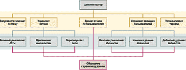Функционирует система следующим образом (рис. 1). Администратор запускает приложение системной консоли, производящее внутреннюю инициализацию и устанавливающее параметры сотовых станций. Система настраивает имена «сот», с которыми работает администратор, и разрешает им начать обслуживание клиентов. С этого момента система позволяет абонентам звонить, получать счета и проводить удаленную оплату, а администратор получает в свое распоряжение консоль, с помощью которой он управляет работой всего оборудования. На рис. 2 показана совокупность функций, которые администратор выполняет с помощью консольного интерфейса.