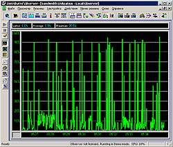 - Утилизация канала связи, или процент его используемой пропускной способности. Считается, что текущая утилизация канала связи сети Ethernet не должна в течение длительного времени превышать 35%, а долговременная — 20%. На рис. 1 показан график текущей утилизации сети Ethernet, полученный анализатором протоколов Observer Light компании Network Instruments (USA).