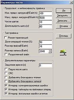 Все входящие в состав пакета FTest тесты выполняют на рабочих станциях сети специальные файловые операции с сервером и одновременно измеряют скорость этих операций и число ошибок, возникающих на прикладном уровне. Тип и интенсивность файловых операций, имя сервера, длительность теста и другие параметры задаются при запуске программы. Диалог задания параметров для одного из тестов представлен на рис. 3.
