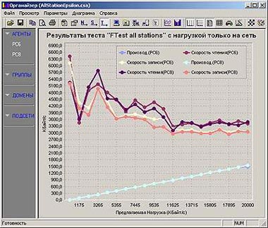 Тест FTest all stations с нагрузкой только на сеть. Здесь все рабочие станции одновременно выполняют одинаковые файловые операции с одним и тем же тестовым сервером, постепенно наращивая их интенсивность. Параметры теста заданы таким образом, что дисковая система сервера практически не нагружена. Этот тест обычно заключается в следующем: