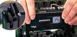 1. Удалите старый процессор. Так как в систему с процессором Pentium II питание на системную плату подается даже при выключенном компьютере, выньте вилку питания из сетевой розетки и воспользуйтесь антистатическим браслетом. Снимите крышку с корпуса компьютера. Если на процессор установлен вентилятор, то отсоедините кабель питания последнего. В случае, когда вместо вентилятора для отвода тепла используется радиатор, снимите его. Ставить вентилятор обратно вам не придется — новый процессор имеет встроенный. Картридж PII крепится в рамке небольшими рычажками. Нажимайте на них до тех пор, пока картридж не освободится. Крепко ухватите его и, аккуратно покачивая картридж из стороны в сторону, осторожно выньте из рамки.