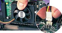 2. Вставьте новый картридж процессора. Выньте новый процессор из защитной упаковки. Чтобы определить, как правильно сориентировать картридж относительно разъема системной платы, обратитесь к Руководству пользователя на процессор. Осторожно установите картридж в рамку (пока он не окажется над разъемом). Затем нажмите на него, чтобы он зафиксировался рычажками в рамке. Наконец, подсоедините кабель питания вентилятора к соответствующему разъему системной платы.