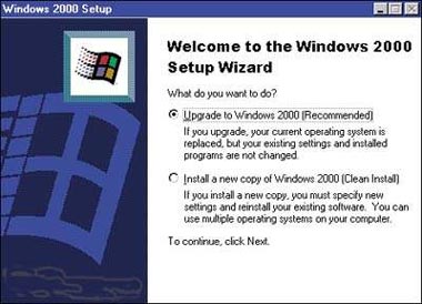 2 Выберите модернизацию или «чистую» инсталляцию. Запустите имеющуюся у вас версию Windows и вставьте в дисковод CD-ROM диск Windows 2000 upgrade. Мастер установки запустится автоматически. Сразу же после начала инсталляции вы окажетесь перед решающим выбором: нужно будет указать, следует ли заменить нынешнюю версию Windows или выполнить «чистую» инсталляцию. Прочтите раздел «Какой путь избрать?» — он поможет вам определить наиболее приемлемый способ.