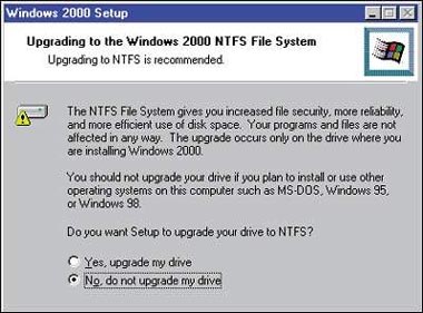 Если вы решите, что Windows 2000 должна быть единственной «живой душой», обитающей в вашей машине, утилита установки спросит, не преобразовать ли разделы диска с используемыми в Windows 9x файловыми системами FAT16 и FAT32 в NTFS5 (NT File System 5) — разработанную для Windows 2000 усовершенствованную версию файловой системы с добавлением шифрования и других новых возможностей. Готовясь дать утвердительный ответ, не забывайте, что после этого будет сложно установить другую операционную систему (например, более раннюю версию Windows).