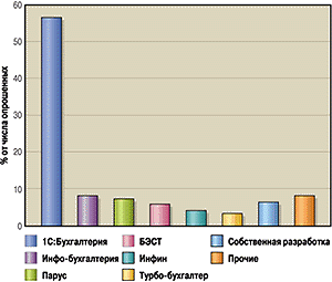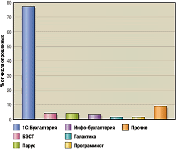 Конечно, нас интересовала популярность бухгалтерских программ среди посетителей выставки. Бесспорным лидером оказалась «1С:Бухгалтерия». Причем даже те, кто работает с другими программами, указывали в анкетах как самый популярный именно этот продукт фирмы «1С».