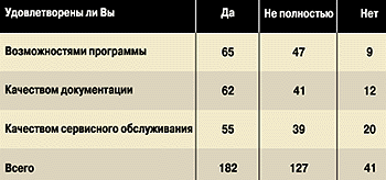 Оценить степень удовлетворенности пользователей продуктом, с которым он уже работает, значило в нашем опросе выбрать один из трех ответов: «да», «не полностью» или «нет» по каждому из трех основных параметров: «возможности программы», «качество документации» и «качество сервисного обслуживания».