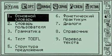 Справочник поможет вам разобраться в лексике, грамматике и фразеологии английского языка. Он содержит словарь — справочник общих терминов, разделенных по темам и категориям, неправильные глаголы — без них английский не выучить — и, конечно, идиомы — их там более двухсот. Приятно, что в устройстве есть функция Перевод текста, с помощью которой можно не только переводить любой английский текст, но (при установленной связи с ПК) и осуществлять «перевод на расстоянии», когда текст загружается с экрана компьютера в «Партнер», переводится и передается обратно на ПК.