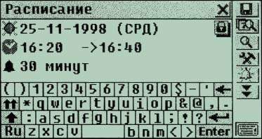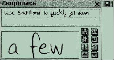 Купив свою первую электронную записную книжку, я понял, что ручку и бумагу все равно придется носить с собой. А вот счастливому обладателю «Партнера» они не понадобятся. Скоропись поможет быстро «набросать» пером несколько строк. В нижней части экрана вы пишете несколько букв, «нажимаете» кнопку, и они в уменьшенном виде переносятся наверх. Таким образом составляется фраза. В принципе Скоропись — рукописный аналог Заметок. Учтите, что распознавать каракули «Партнер» не умеет, для него это просто рисунок.