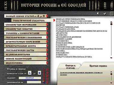 Пожалуй, главный рабочий раздел, в котором быстрее всего можно найти нужные сведения, это «От «А» до «Я»». В нем содержатся алфавитный список статей, указатель с 44 темами, список упомянутых в энциклопедии персоналий (около тысячи имен), упорядоченный по алфавиту перечень исторических событий, словарь терминов и словосочетаний, справочники по географическим названиям, архитектурным сооружениям и примечательным местам, географические карты, аудиокомментарии, иллюстрации и видеохроника. В общем, если известны имена и названия, о которых нужно получить сведения, то пожалуйте именно сюда.