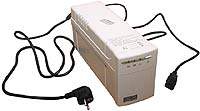 Источник бесперебойного питания сероватого цвета, имеет небольшие размеры. Он оснащен двумя розетками для подключения монитора и системного блока. В комплект поставки входит пара кабелей, один соединяет розетку с ИБП, другой — ИБП с монитором (или системным блоком), поэтому необходим дополнительный кабель, такой же, как для соединения блока питания с монитором.