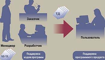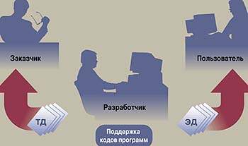 Исторически сложилось так, что документация на ПО разделилась на техническую и эксплуатационную (ТД и ЭД соответственно). Это было связано с тем периодом развития вычислительной техники, когда участие человека в функционировании систем было более активным, а также с организацией проектирования и внедрением АСУ, где и применялись главным образом программные средства. Системные представления о документации ПО базировались на том, что необходимо было учитывать взаимодействие заказчика, разработчика и пользователя-эксплуатационника (рис. 1).