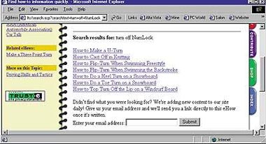 Хуже всех на этой группе вопросов проявил себя узел EHow.com — база знаний, охватывающая далеко не только работу на компьютере. Спросите EHow, как приманить колибри, и он даст несколько полезных рекомендаций. А теперь спросите, как отключить NumLock. На запрос How to turn NumLock off мы получили короткий список не относящихся к делу советов, начинавшийся с How to Make a U-Turn (как выполнить разворот) и заканчивавшийся на How to Top Turn Off the Lip on a Windsurf Board (как сделать поворот на гребне волны на виндсерфере). Поисковая система EHow работает с запросами на естественном языке, но недостаточно интеллектуальна, чтобы понять, о чем речь. И если спросить ее, как в Windows отключить Панель задач (How to turn off the taskbar in Windows?), она выдаст список ответов, в котором будут и вездесущий разворот, и объяснение, как перевернуться при плавании на спине (How to Flip-Turn When Swimming the Backstroke).