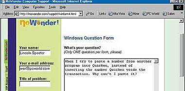 Исключением стал вопрос о вводе цен акций в Quicken. Здесь объяснение эксперта тоже оказалось недостаточно подробным, но в форуме нам дали всего один ответ, да и тот абсолютно неверный. Зато NoWonder был единственным местом, где нам правильно ответили на вопрос о вставке в Quicken, причем и эксперт, и некая добрая душа из форума. Мы тестировали на NoWonder также консультации экспертов в режиме чата, которые тогда отлаживались. К сожалению, это средство находилось еще на ранней стадии разработки и потому не особенно порадовало нас немедленными правильными ответами.