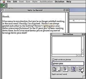 Однако тот, кто работал с пакетом ViaVoice компании IBM, позволяющим диктовать тексты в нормальном темпе, возможно, будет разочарован: Voice-Power Pro по-прежнему требует, чтобы слова произносили с расстановкой. К тому же в этой программе не предусмотрен метод исправления произвольно выбранного слова — «random-access correct» (см. врезку «Два способа правки»). С другой стороны, Voice-Power Pro может работать с любым текстовым редактором для Macintosh. Но самое главное то, что это ПО обеспечивает управление ОС, т. е. вы можете оперировать меню, диалоговыми окнами, пиктограммами, используя встроенный язык AppleScript. С этой точки зрения Voice-Power Pro любой версии является программой, предназначенной исключительно для Macintosh, и сочетает в себе функции управляющих ОС и транскрибирующих текст программных средств.