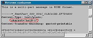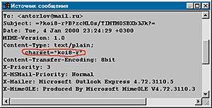 Русифицированная версия Microsoft Outlook Express 5.0 по умолчанию для всех отправляемых сообщений ставит кодировку KOI-8 и отправляет их именно в ней. Однако некоторые почтовые программы могут делать ошибки, например письмо написано в KOI-8, а в заголовке письма проставляется, что оно имеет кодировку Windows-1251. Если такое письмо будет отправлено адресату, то оно не сможет сразу же правильно отобразиться в его почтовой программе — на экране появится мешанина из символов. Поскольку почти все почтовые программы позволяют просматривать одно и то же письмо в разных кодировках, то получатель прочитать его все же сможет, выбрав правильную кодировку. Но если письмо с не соответствующим содержанию заголовком попадет на перекодирующий почтовый сервер, то ситуация осложнится. По заголовку сервер решит, что раз оно написано в Windows-1251, как было указано, то его нужно перекодировать в стандартную для Сети (по мнению сервера и его создателей) кодировку KOI-8. Сообщение будет преобразовано из Windows-1251 в KOI-8, т. е. будут заменены соответствующие коды символов. Однако письмо-то уже изначально было в KOI-8! И что же получается? Автор письма написал фразу «Добро пожаловать», которая в KOI-8 записалась как «дНАПН ОНФЮКНБЮРЭ». А сервер снова перекодировал ее, но уже из Windows-1251 в KOI-8. В результате получилось: «Дмюом нмтчймачпщ», и понять что-либо стало уже невозможно. Если же на пути письма попалось несколько перекодирующих почтовых серверов, то его дешифрация становится крайне сложной задачей.