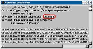 К этому письму приложен архив 999.zip, а также указан способ конвертации вложения — base64. Дальше идет набор символов первой половины кодовой таблицы — можно с уверенностью утверждать, что он пройдет через любые почтовые серверы неизмененным. При получении такого письма Outlook Express распознает наличие вставки base64, отобразит вложенный файл на панели вложений и позволит сохранить его на жесткий диск или прочитать, подвергнув обратному преобразованию из base64.