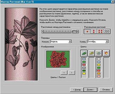 Разместив на плане ограждения, дом, садовые дорожки, светильники, фонтаны, качели (всего более 100 объектов), загляните в Энциклопедию растений (более 3000 названий) и найдите там подходящие с учетом высоты, цвета и других разнообразных параметров, соответствующих вашему выбору. Такой раздел программы, как Консультант-агротехник, составит годовой календарь ухода за растениями и не просто даст подробные инструкции по каждой операции ухода, но и пояснит их анимацией.