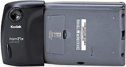 PalmPix Camera фирмы Kodak подсоединяется к последовательному порту устройств Palm III и VII, а также к Palm Vs с помощью дополнительного адаптера Dock V. За счет разрешения 640х480 точек, 24-битового цвета и двукратного zoom, PalmPix обеспечивает более качественные фотографии, чем у камеры Eyemodule. Можно также установить разрешение 320х240 точек. Date Book кнопка служит, как и у многих других фотоаппаратов, для автоматической установки выдержки затвора: первое нажатие — установка, второе — съемка. Выдержка затвора лежит в диапазоне от 1/15 с (для слабого освещения) до 1/500 с (например, для съемки быстродвижущихся объектов при сильном освещении). Устройство Palm IIIc позволяет принимать изображение сразу в цвете, а остальные модели показывают лишь черно-белое. Кнопка прокрутки управляет цифровым двукратным увеличением zoom, но эта опция работает только при разрешении 640х480 точек. Одна фотография, сделанная на PalmPix, требует 100 Kбайт памяти. Нужно учитывать, что при предварительном просмотре на Palm и на Visor приходится ограничиваться низким разрешением экрана карманного компьютера — изображение можно увидеть в самом грубом приближении. На Palm IIIc оно получается хоть и цветным, но в пятнах, да и объектив там расположен очень неудобно.