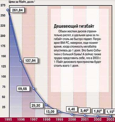| Источники: International Data Corporation, Storage Hardware Research Group. 1 Cредняя стоимость 1 Гбайт жестких дисков с IDE-интерфейсом для настольных ПК. 2 Прогнозируемые данные. |